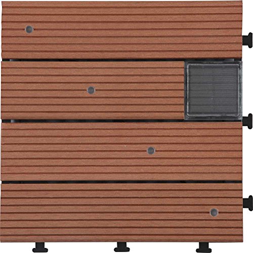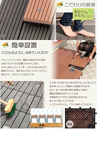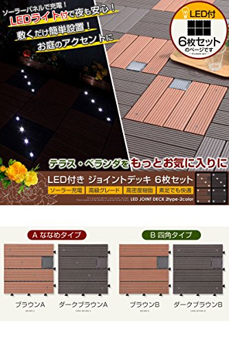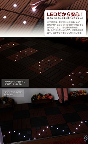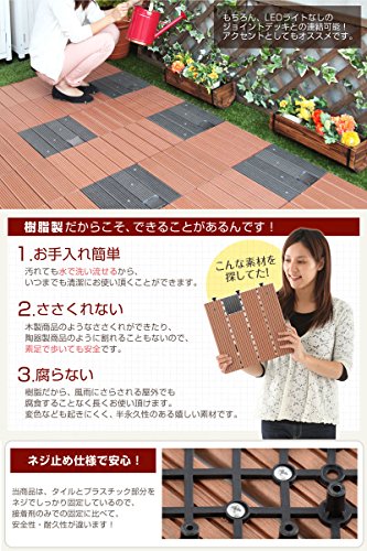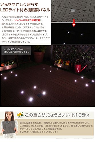 - 夜をほのかに彩る、LED照明付きのジョイントデッキです。4方にあるジョイント部分を上からはめ込むだけだから、女性でもラクラク設置できちゃいます♪設置は簡単だけれど、繋ぎ合わせることでしっかりと固定されるから、ズレたり強風で飛んでしまう心配もありません。また木製合成樹脂でできているため汚れても水で洗い流せてお手入れ簡単♪木製商品のようなささくれができたり陶器製商品のように割れることもないから、素足で歩いても安全です。風雨にさらされる屋外でも腐食・変色することなく長くお使い頂ける、半永久性のある嬉しい素材です。LED照明はソーラーパネルでの充電式で、電源コードや電池も不要!設置簡単・お手入れ楽々♪夜の足元を、静かに優しく照らします。