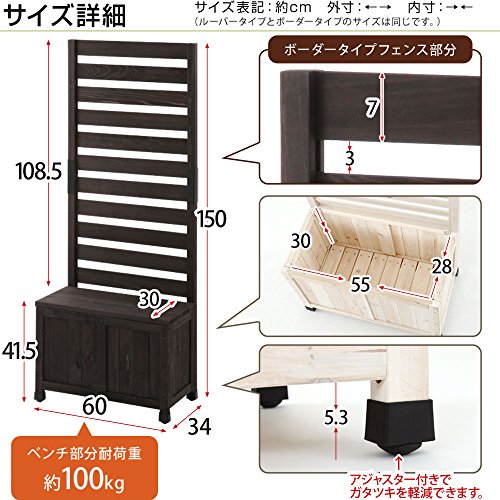 - 【材質】天然木杉材 【塗装】本体:水性ステイン塗装、ベンチ:ラッカー塗装 【耐荷重】ベンチ部:約100kg、連結部:約70kg 【カラー】ボーダーDBR、ボーダーWH、ルーバーDBR、ルーバーWH ※2018年2月15日仕様変更しました。(ホワイトの金具を白に変更しました。)
