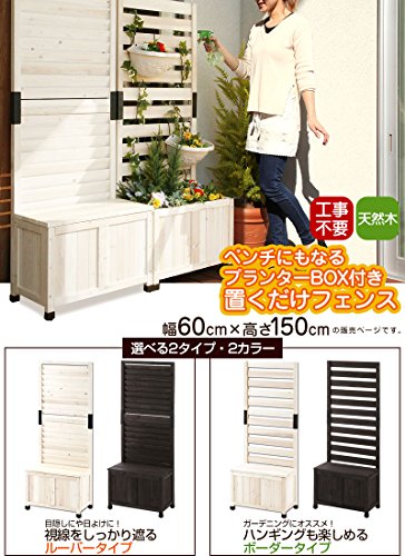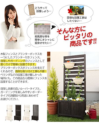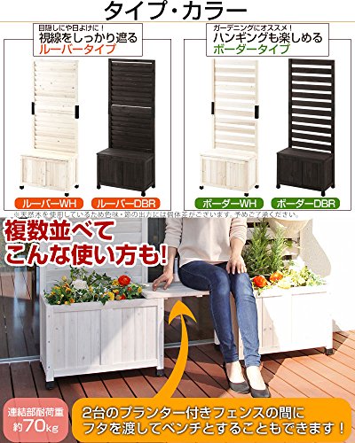 - 工事不要!置くだけで簡単にフェンスが設置できるプランター付きフェンスです。しっかり目隠しできるルーバーと、ハンギングなども楽しめるボーダーの2タイプをご用意いたしました。プランターボックスには市販のプランターを入れてガーデニングを楽しんだり、付属の蓋を取り付けてベンチとして使ったりすることができます。蓋の裏側には防水パネルが付いているため、プランターボックスをガーデニング用品やお子様のおもちゃ収納としても◎2台並べた間に蓋を渡して、ベンチとすることもできます。