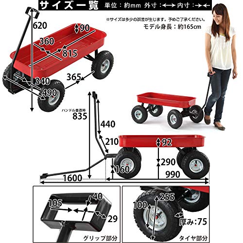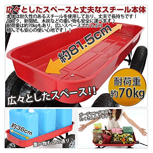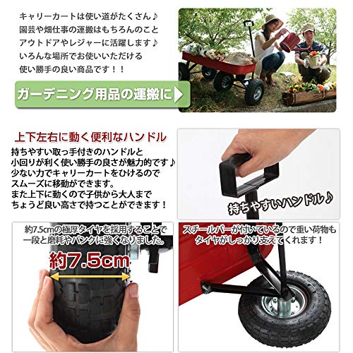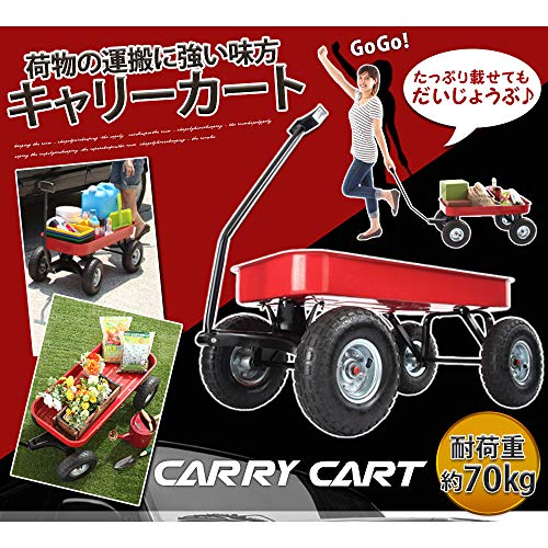 - かっこいい真っ赤なデザインと長いハンドル。オシャレかつ実用的なキャリーカートが登場!移動が便利なだけに用途は沢山あります!!園芸や畑仕事の運搬はもちろんのことアウトドアやレジャーにも活躍しちゃいます♪野外で使うのも良いし、お部屋の中で人形やぬいぐるみを乗せて飾ったりして遊んでも良し!子供も大人も楽しめるキャリーカートで一味も二味も違った楽しいライフを満喫してみてはいかがですか?