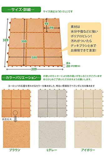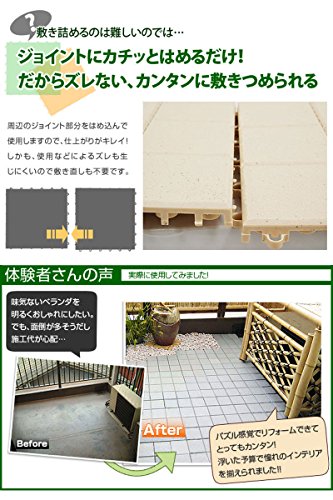 - あなたのベランダ・テラス・バルコニーをリメイク!自分でヨーロッパの石畳のようなタイル張りにリフォームすることができるインテリアタイルです。あらかじめ置きたい場所のサイズを測り、必要分のパズルをジョイントしていくだけ!ジョイント部もカンタン設計でキレイに仕上がります。また、水はけのよさも抜群。明るい色で、光を呼び込みます