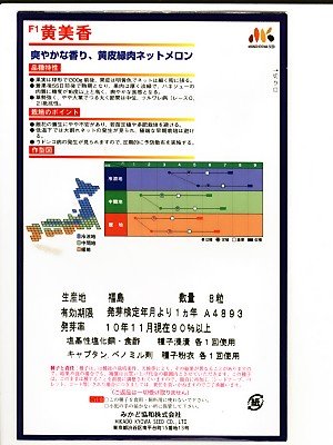黄美香メロンは、高糖度の黄皮緑肉のネットメロン品種です。 黄美香メロンは、糖度が非常に高くなる特性があります。 16度ぐらいの高糖度になるようです。 甘いだけではなく、爽やかな香りが楽しめるおいしいメロン品種です。 果の皮が明黄色でネットが細かく入るタイプの緑肉ネットメロンです。 黄美香メロンは、農産物直売店などでの差別化商品として向いているおいしいネットメロン品種だと思います。 メロンの味にこだわりたい農家におすすめです。 着実後55日ぐらいで熟期になります。