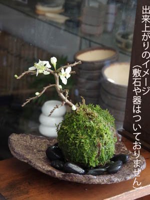 - 直径約9cmくらいの白長寿梅の苔玉が作れるキットです。春と秋によく花が咲き、夏と冬は葉が落ちます。