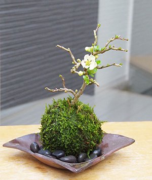 年に数回可憐な花が楽しめます。名前も縁起がいいでしょ?【白長寿梅(しろちょうじゅばい)の苔玉・焼締茶器セット】 (黒石)
