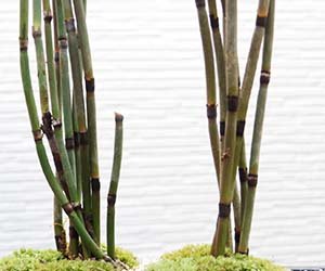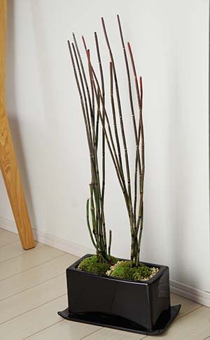 トクサは成長期に上へ上へと伸びて行きます。その姿はとても凛々しく見えます落ち着きあるモダンな黒陶器であわせてみました。その姿はとても凛々しく見えます。硬い茎は昔、木工品を磨く材料に使われていたそうです。育て方のしおり、約1年分の肥料がついています