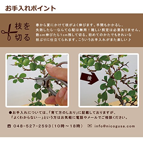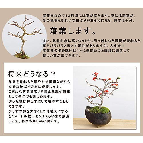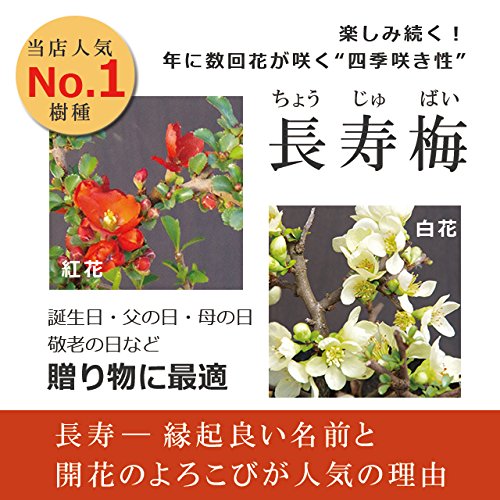 - 四季咲きといって年に数回花が楽しめますので、季節を問わず贈り物に最適です。「長寿」の名前どおり、縁起のいい植物として知られ、「父の日」や「母の日、」「プレゼント」にぴったりの苔玉です。梅と同じバラ科ですが、梅ではなく草木瓜(くさぼけ)の一種です。細かい枝が多くでるので小さいながらも、風格ある作品に仕上がります。