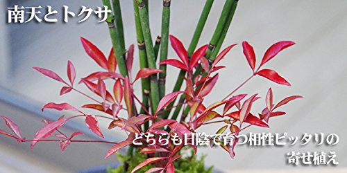 - トクサは年間を通して美しい緑が楽しめます(常緑)南天は日陰でも育つ丈夫な植物です。夏以降は肥料を与えず、秋~冬に寒さに当てると美しい紅葉が楽しめます。