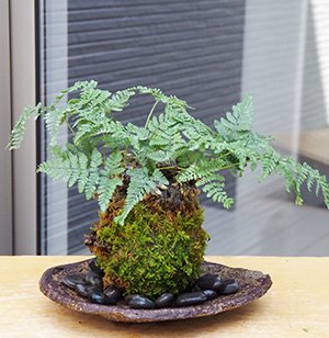 太い根茎、涼しげな葉が魅力のシダ植物【しのぶ(シノブ)の苔玉・くらま岩器セット (敷石の色(黒))