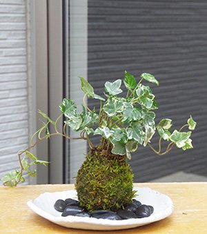 苔玉の入門版、丈夫で育てやすい【アイビーの苔玉・楕円白粉引器セット】 (敷石の色(黒石))