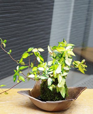 黄金(黄色に近いかも?)の斑が鮮やかな葉が1年中楽しめます。蔓(ツル)植物ですので垂れ下がるように育っていきます。 青々とした苔の色とコントラストがとても美しい苔玉。そんなテイカカズラを、焼締茶器であわせてみました。敷石の色をお選びください。 ※植物は季節によって、冬枯れや開花前など写真とイメージが異なる場合がございます。あらかじめご了承ください。