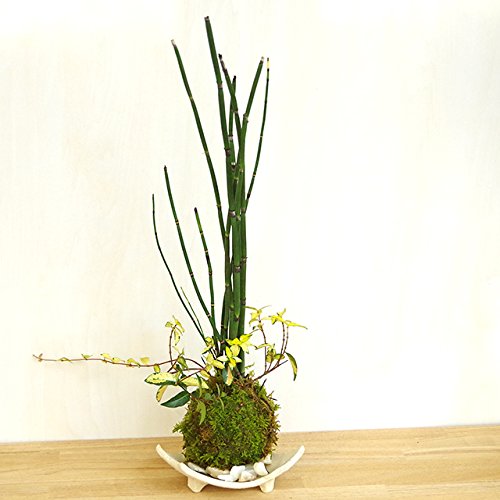 トクサは成長期に上へ上へと伸びて行きます。 その姿はとても凛々しく見えます。黄金(黄色に近いかも?)の斑が鮮やかな葉が1年中楽しめるテイカカズラを寄せ植え。その姿はとても凛々しく見えます。硬い茎は昔、木工品を磨く材料に使われていたそうです。また止血剤としての薬効もあるそう。そんなトクサ・テイカカズラの苔玉を信楽焼白三つ足器であわせてみました。敷石の色をお選びください(敷石の効果はこちらをクリック)