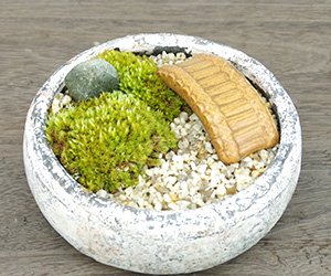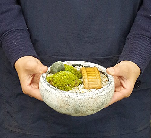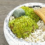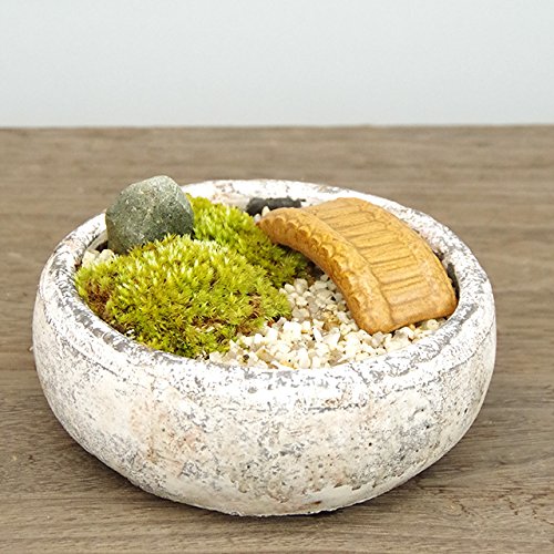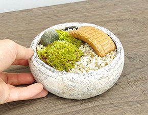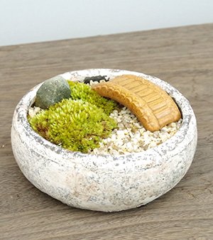 石、苔、橋、川と回遊式庭園を手のひらサイズに再現。心落ち着かせてくれる風景をお楽しみください。この小さな世界の中に雄大な景色が凝縮されています。モダンな白丸陶器鉢が苔をやさしく包み込みます。橋は自由に動かせますので、お好きな風景を創り出してください。