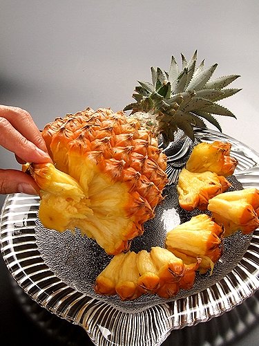 通常のパインアップルより小ぶり(600g~1.2kg)なパインですが、固い皮を剥くことなく簡単に手でちぎって食べられ、芯まで丸ごと食べられるちょっと不思議で、おいしいパインです