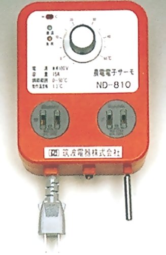 農電電子サーモは、高性能ICを使用した、高感度/高精度/使いやすさ抜群の電子サーモです。 農電園芸マットと併用すると、面倒な温度管理から解放され、また電気代の節約にもなります。 『省エネルギー効果』の面でも、たいへんお勧めです ■ヒーター/換気扇兼用 本体上面のスイッチ切り換えによって ヒーター(農電ケーブル)制御/換気扇制御のどちらでも使え、たいへん便利です。 ■コンセント方式 サーモ本体に負荷専用のコンセントがついています。 面倒な配線の手間が省け、どなたでも簡単に使えます。 ■適温表示灯(ND-810/ND-820) 感温部が設定温度になっているかどうか一目でわかります。 ■接点出力(ND-810/ND-820) 農電補助リレー/ボイラー/天窓制御などに必要な『接点出力』を備えています。 サーモの用途が変わっても安心してご使用いただけます。 型 名 ND-810 許容電流 抵抗 16A 誘導 1.6A 容量 (農電ケーブル) 家庭用100V 1.6kW 単相200V ×(使えません) 三相200V ×(使えません) コンセント 2 感温部 リード線長 5m 温度範囲 0~50℃ 温度精度 1.5℃ 備 考 ND-700シリーズの上位機