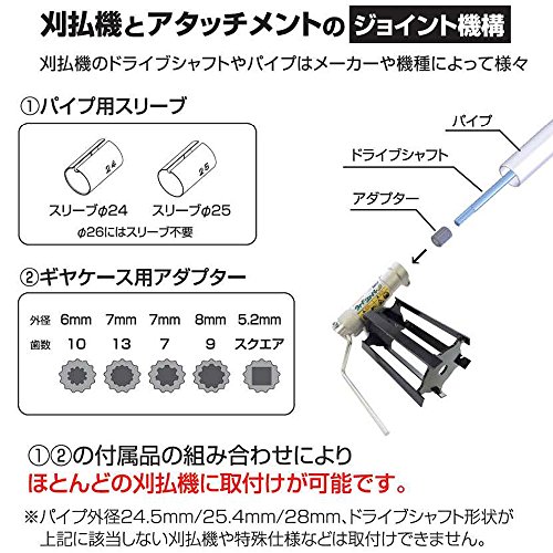 ●【特徴】●市販のエンジン式刈払機に取り付け可能です。●短い雑草を土ごと砂利ごと削ります。●ゆっくり回転するので安全で安心です。●肥料などが攪拌できます。●削り深さ調整機能付きです。●長さ(mm):203●幅(mm):183●高さ(mm):110●質量(kg):1.3●【セット内容_付属品】●取り付けキット(アダプタ5種類・スリーブ2種類)●【原産国】JP