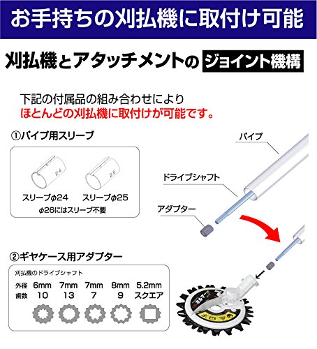 ●【用途】刈払機アタッチメント。●【機能・特長】物損事故・切創事故を未然に防ぐ草刈の安全を追及したプロフェッショナルツールです。上下刃逆回転ハサミ刈り方式により石などの飛散が抑制され、人のいる所や建物、道路周辺などで効率よく草刈りができます。刈刃が障害物に触れても跳ね返り(キックバック)が少なく安全です。水田の水キワ除草も安全でスムーズに行えます。●外観:アルミ(A5052)。●カッター部:SKS5他。●付属品:取付けキット、刃保護カバー。【注意事項】本体内部のギヤへの負担が大きくなるため、消耗した刃は研磨や交換を行って下さい(また、本体内部への異物侵入につながるので底板が消耗した場合も交換を行って下さい)。切れ味が悪いまま使用されますと作業効率が低下し、作業者の身体的疲労や本体の故障の原因となります。