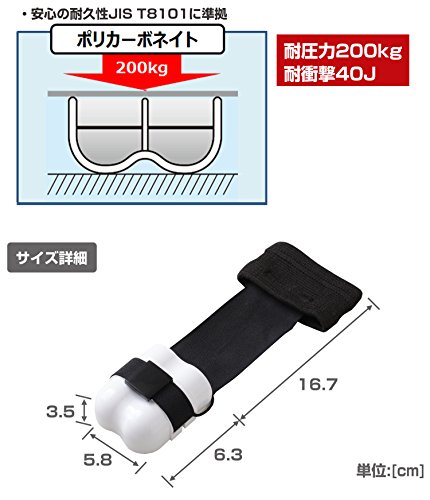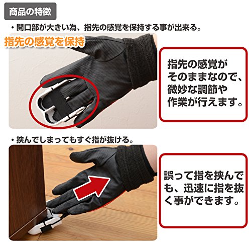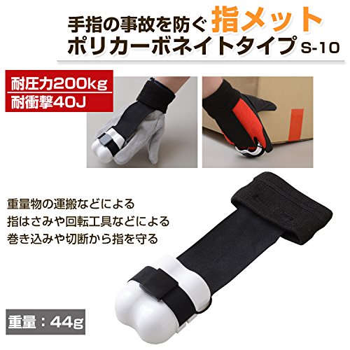 [材質]本体・ジョイント=ポリカーボネート/ゴム=ポリエステル・ウレタン [重量]44g [入数]1個 [耐久性]耐圧迫=200kg/耐衝撃=40J [用途]指のはさまれ事故からの指先保護 [特長]1)装着時に指の腹が運搬物に直接触れるよう、本体に開口部を設けています。指の曲げ伸ばしが容易になり、人差し指を自由に動かすこともでき、指先の間隔を保ち、繊細な作業も安全に行えます。 2)圧迫や衝撃・切削などの作業に最適。誤って指をはさんだ場合、本体からそのまま指を抜くことで、危険な状態を回避できます。 [注意点]1)事故を完全に防御するものではありませn。 2)使用中にはさまれたり、回転体と接触した場合には直ちに指を抜いて危険を回避してください。 3)回転工具を使用する時は、手袋・サポーターを併用しないでください。 4)一度でも衝撃を受けた場合は、外観の如何に関わらず使用を中止してください。