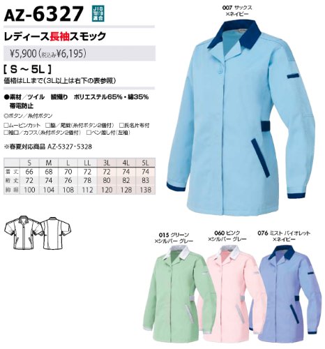 秋冬物 AITOZ アイトス レディース長袖スモック AZ-6327 076ミストバイオレット×ネイビー 4L