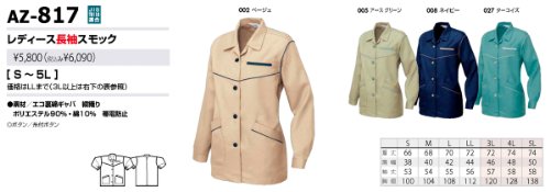 AITOZ(アイトス) #AZ-817 レディース長袖スモック【秋冬】帯電防止 作業服 アースグリーン 3L