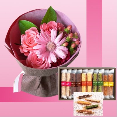 - ★母の日ギフト注文集中のため、5月3日~9日までの配達指定は承ることが出来ません。 [ピンク花束] ●花束サイズ:[長さ]約30cm [幅]約20cm ●生花:バラ、ガーベラ、季節の花やグリーなど。 ●箱サイズ:50x25x25cm(フラワーギフト用ホワイトBOX) ●装飾品等:液体肥料・お取扱いのしおり・包装紙・リボン ※見本画像はイメージです。商品の特性上、イメージとデザインなどが多少異なる場合がございます。 ※常に新鮮な生花をお届けするため、入荷状況により同じ花でも品種が異なり、色の濃淡や柄などが見本と多少異なる場合がございます。 [5つの素材ロングケーキ10本] ●内容:スティックケーキ(抹茶・オレンジ・チョコレート)・フロランタン・ショコラパイ×各2本 ●箱サイズ(cm):縦19.2×幅37.5×高4 ●保存温度帯:常温 ●賞味期限:30日以上の状態でお届けします。 ●アレルゲン:小麦、卵、乳