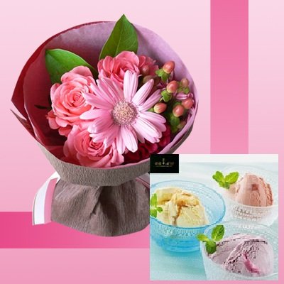 誕生日プレゼント ピンク花束&千疋屋プレミアムアイス10個 お母さんへのメッセージカード付き