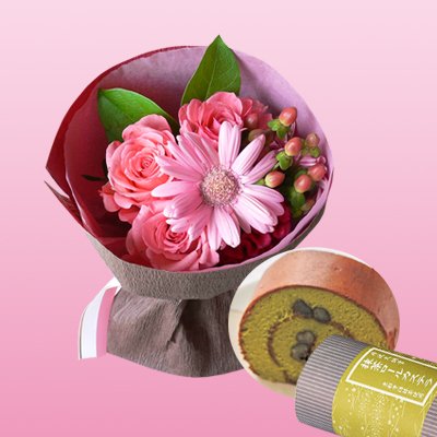 誕生日プレゼント 花 母親 祖母 京都大つぶ黒豆筒カステラ(抹茶) & ピンクの花束