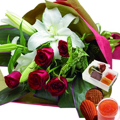 花とスイーツ ギフトセット 豪華 ユリ レッドバラ 花束 と 国産野菜とフルーツの無添加ゼリー&野菜スイーツ洋菓子詰合せ 写真入りメッセージカード