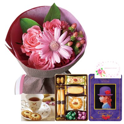 花とスイーツ ギフトセット かわいい ピンク バラ ミックス花束 と 赤い帽子 パープル 写真入り・名入れメッセージカード