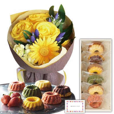 - [ラウンド花束] ●花束サイズ:[長さ]約30cm [幅]約20cm ●生花:バラ、ガーベラ、季節の花やグリーなど。 ●箱サイズ:50x25x25cm(フラワーギフト用ホワイトBOX) ●装飾品等:液体肥料・品質の保証とお取扱いのしおり ※お花の見本画像は、イメージです。 ※生花は、季節やその日の入荷状況により、花、品種、色の濃淡多が多少異なります。 ※ラッピングは、季節や在庫状況により見本と異なる場合がございます。 【セット商品詳細】蜂蜜とクリームチーズが入ったもっちり生地に、さわやかな甘み。マリー・アントワネットの好物だったと伝えられるヨーロッパ生まれのクグロフ。クランベリーやパイン、抹茶やチョコを使い、食べやすいこぶりなサイズに仕上げました。生地にたっぷり練り込んだ蜂蜜やクリームチーズが、果物のさわやかさを引き立てます。[商品内容]ココナッツ&キャラメル×2個、ストロベリーinクランベリー・パイン&アールグレイ・抹茶in小豆・チョコ&バナナ×各1個[お届け状態]常温[賞味期間]50日[7大アレルゲン]/卵//乳//小麦/