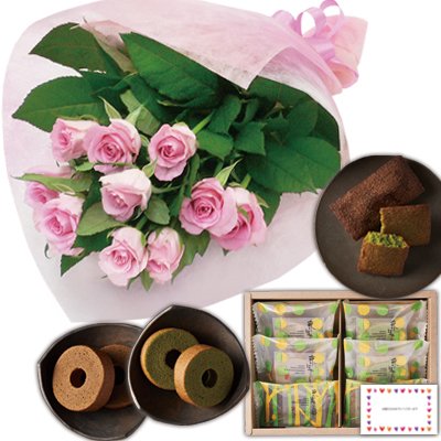 花とスイーツ ギフトセット エレガント ピンク バラ 花束 と 京都高級抹茶使用のスイーツ 写真入り・名入れメッセージカード
