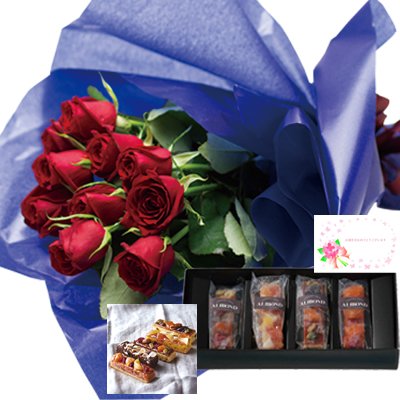 花とスイーツ ギフトセット エレガント レッドバラ 花束 と アマンド 六本木ケーキ 写真入り・名入れメッセージカード