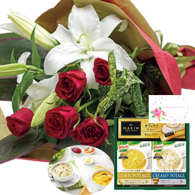 花とスイーツ ギフトセット 豪華 ユリ レッドバラ 花束 と クノールスープとコーヒーセットA 写真入り・名入れメッセージカード