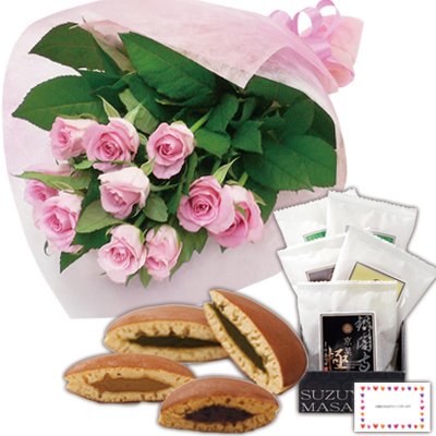 花とスイーツ ギフトセット エレガント ピンク バラ 花束 と 京都 老舗 どら焼き 写真入り・名入れメッセージカード