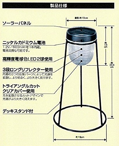 - 仕様:ライトサイズ(cm):直径約10×高さ約13 LED2球使用 使用電池:ニッケルカドミウム電池1本内蔵(1.2V/600mAhを1本内蔵。電池交換可能) 3段ロングリフレクター使用 トライアングルカットクリアカバー使用 点灯時間:約7時間