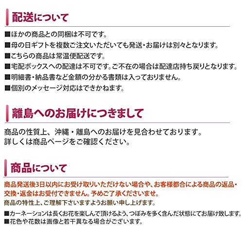 ※明細書、納品書など金額の分かるものは同梱しておりません。母の日ギフトは生花ですので長時間の輸送には適しておりません。【2日以上かかる地域】につきましては、新鮮な状態でのお届けができない可能性がございます。また、母の日までのお届けが出来かねる可能性がございます。