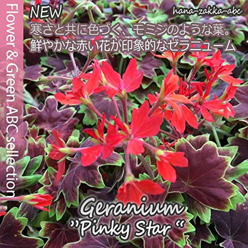紅葉したモミジ葉が なんとも美しいゼラニウム! 品種「ピンキースター」のオレンジ花タイプ コリウスのようにカラーリーフとしても楽しめ花も可愛らしい! 1鉢で2度3度と楽しめる観賞価値の高いゼラニュームです。