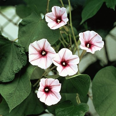 夕方頃から翌日の午前中まで花を咲かせるので ヨルガオとも呼ばれています。淡い紅紫花。 ほのかな香りも楽しめます。