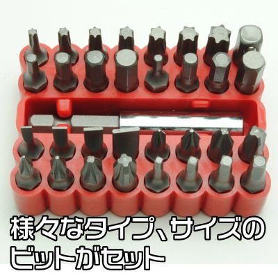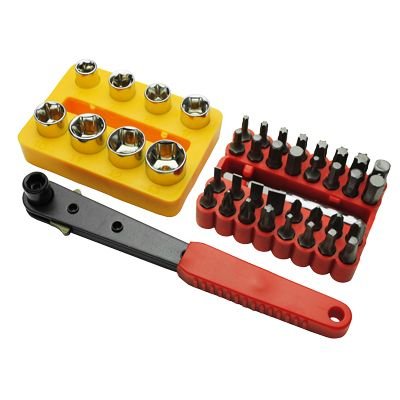 プッシュリリース式のビットラチェットハンドルと、ビット、ソケットのセットになります。