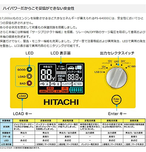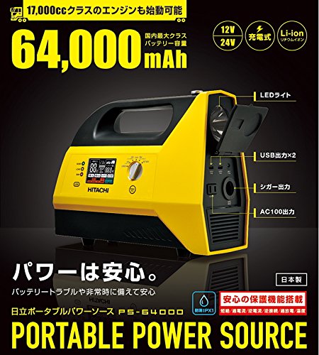 - ●型番:PS64000●サイズ(mm):252×132×330●バッテリー容量:64000mAh●ジャンプスタート対応車:6000cc以下の12V車・17000cc以下の24V車●充電方法:専用充電器(シガー充電・AC充電)