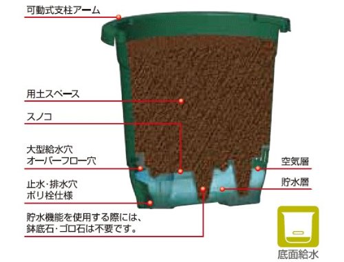 貯水槽に水を入れやすい大型給水穴や、可動式になった支柱アームなど、機能性がアップしています。 本体表面にはお洒落なレリーフが入っており、家庭菜園をもっと楽しめるデザインになりました。 トマト、なす、きゅうり、大根、ニンジン、小松菜(アブラナ科の一般野菜)など、色々な野菜を育てることができます。 約2.7リットルの貯水機能付きなので水枯れの心配がありません。 また空気の流通をよくするサイドスリットで根ぐされ防止! 貯水機能を使用する際には、鉢底石やゴロ石は不要です。 ※支柱は商品に含まれておりません。 市販の支柱をご使用下さい。