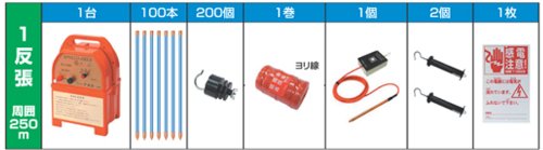 - セット内容:エリアシステム本体/1台、エリアポール(径20mm×900mm)/100本、ポール碍子/200個、ヨリ線(500m)/1巻、エリアチェッカー/1個、ゲートグリップ/2個、危険表示板/1枚