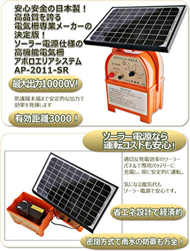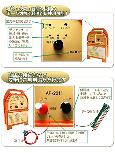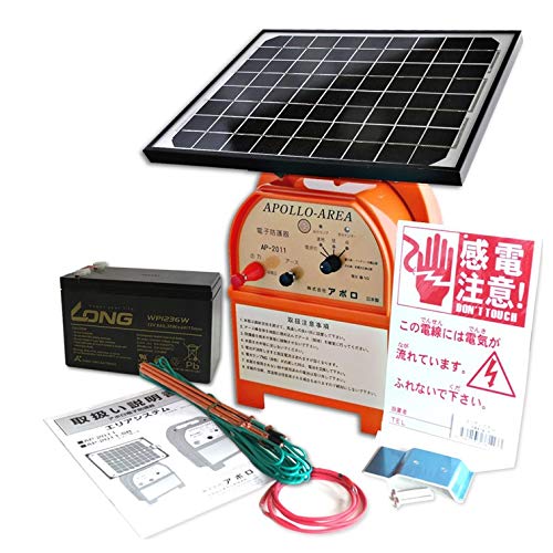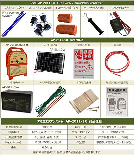 - セット内容 AP-2011-SR:本体(本体標準セット付き)・ソーラーパネル・専用バッテリー エリアポールΦ20×900mm/50本 ポール碍子/100個 ヨリ線/200m2巻 ゲートグリップ/2ケ エリアチェッカー