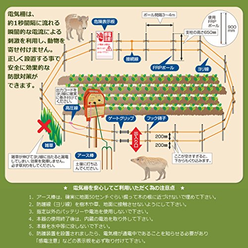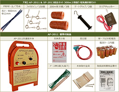 - セット内容 AP-2011本体(本体標準セット付き) SP-2013延長キット(FRPポールΦ11×900mm/25本 フック碍子/50個 ヨリ線/200m1巻)×3セット ゲートグリップ/2ケ エリアチェッカー