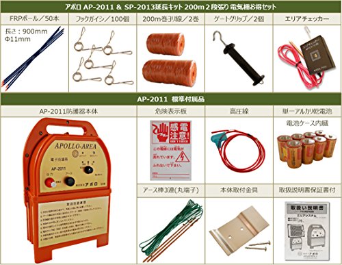 - セット内容:AP-2011本体(本体標準セット付き) SP-2013延長キット(FRPポールΦ11×900mm/25本 フック碍子/50個 ヨリ線/200m1巻)×2セット ゲートグリップ/2ケ エリアチェッカー