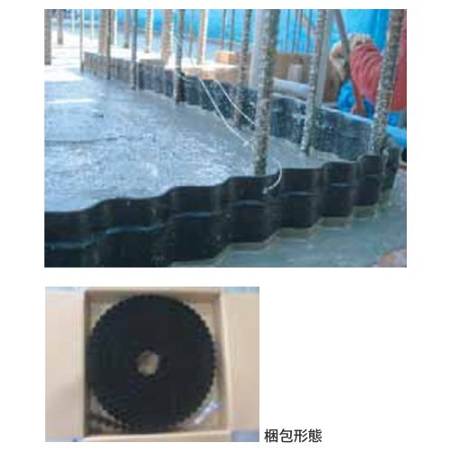 形状を波型にすることで、コンクリート打設時のたおれ・ねじれが生じません。 表面のシボ加工とリブにより、コンクリートとの密着性も良好です。 特殊樹脂使用で柔軟性があるため、曲げた状態でも割れることがありません。