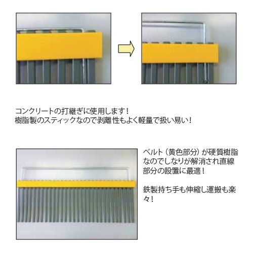 コンクリートの打ち継ぎに使用します。 剥離性のよい樹脂製スティックを使用した、軽量で扱い易い商品です。 ベルト(黄色部分)が硬質樹脂なので、しなりが解消され直線部分の設置に最適です。 可動式のスティックで設置もスムーズ! 鉄製持ち手が伸縮し、運搬もラクラク!