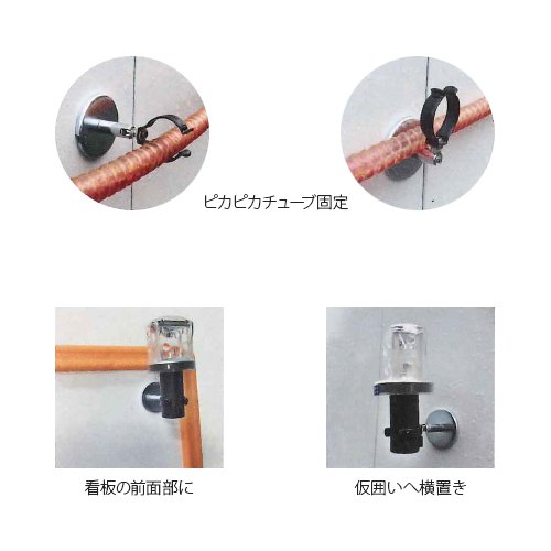 LEDソーラー(別売)を差し込むだけ! ピカピカチューブも固定できます。 マグネット式なので簡単に設置できます。 可動式でタテ置き、ヨコ置き自由自在です。 先端部のPVC加工により殺傷予防!