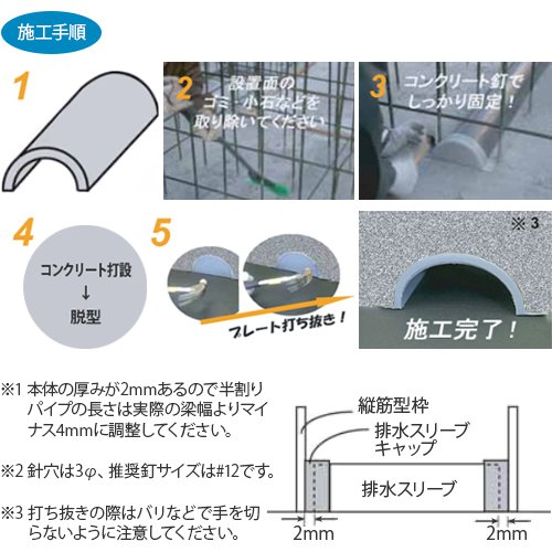 地下排水用半割パイプの固定とノロ止めの、ダブル効果が期待できます。 セットして釘打ちするだけの簡単施工。 脱型後「打ち抜きプレート」部を、ハンマー等で叩くだけで、仕上がりがキレイになります。