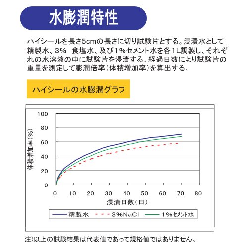 約1.7倍膨潤して打繋ぎ部に生じる空隙を塞ぎ、優れた止水効果を発揮します。また、低膨潤倍率のため、コンクリート躯体へ悪影響を及ぼしません。