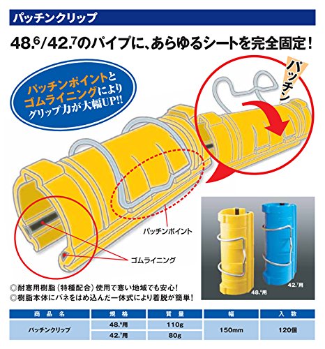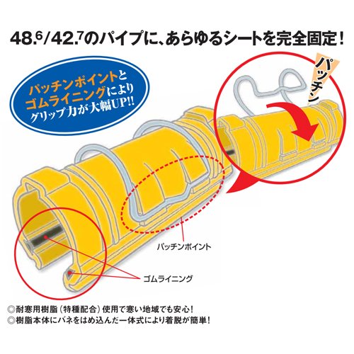48.6φのパイプに、あらゆるシートを完全固定! パッチンポイントとゴムライニングによりグリップ力が大幅UP!! ゴムライニングとバネ位置改良により、グリップ力が大幅にUPしました。 あらゆるシート類の完全固定に最適。 耐寒用樹脂使用のため寒い場所でも安心。 樹脂のカバーにバネをはめ込む一体式により着脱が簡単。